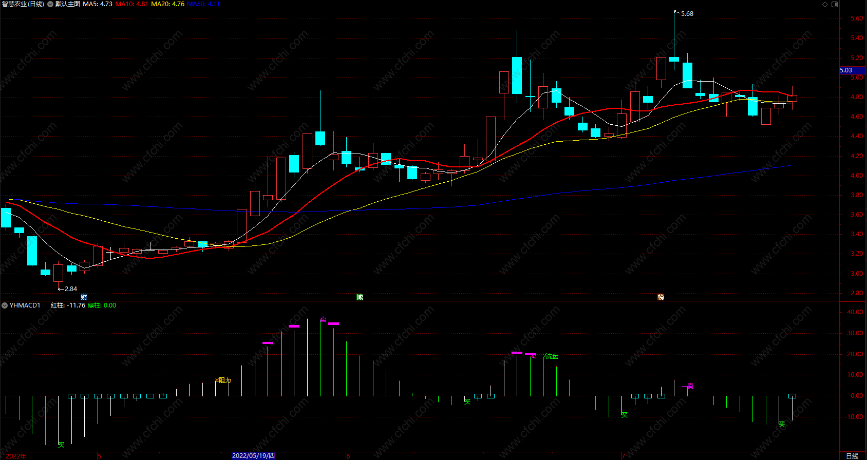 DRAWTEXT(FILTER(缩头,3) AND 缩头,1.5*(DIFF50-DEA50)+0.2,'卖'),COLORFF00FF;
