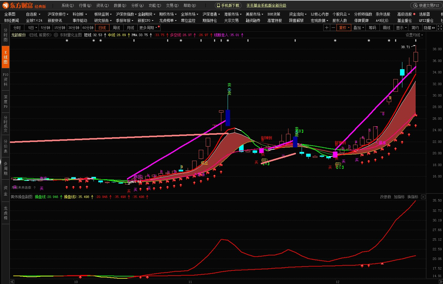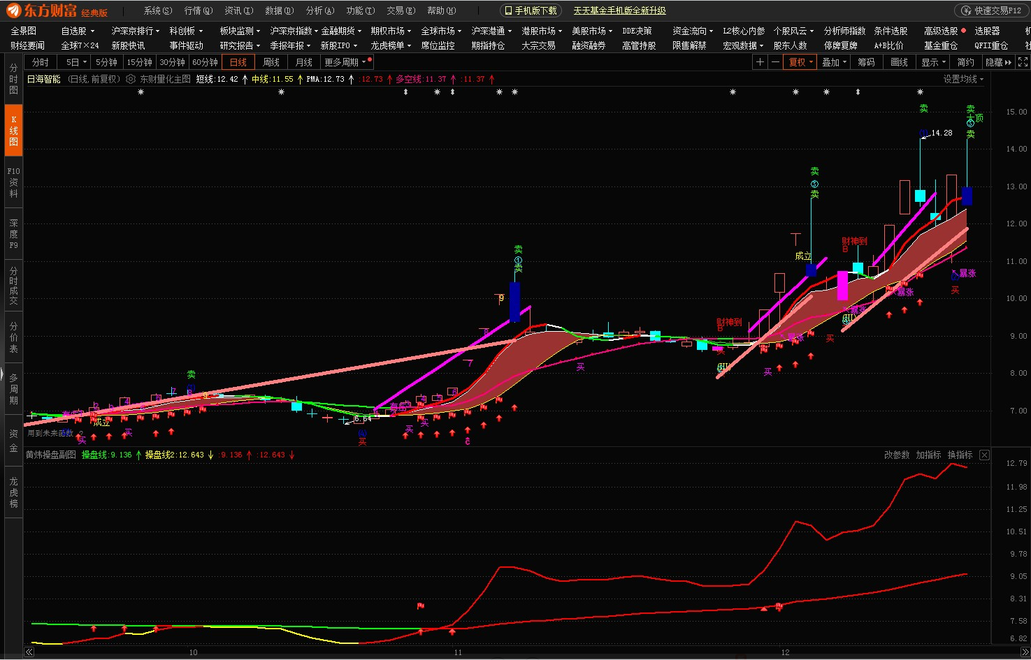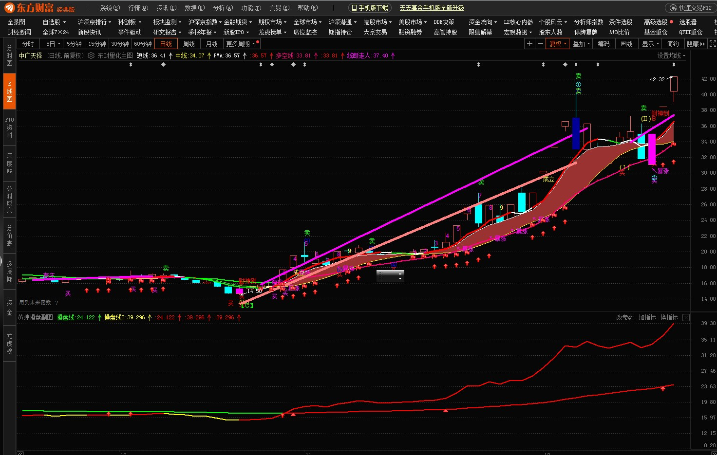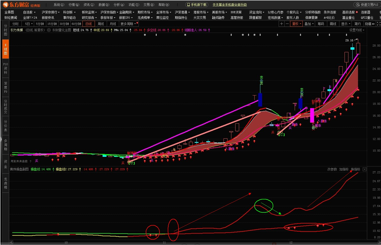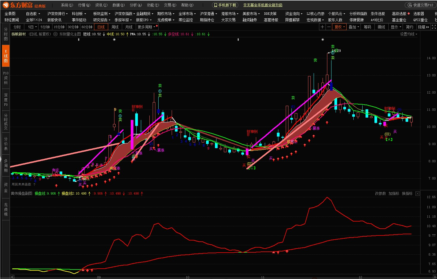 东方财富黄炜操盘副图,2条操盘线刚出现红色则买入,上线拐头向下卖出,有向上三角形,箭头,红旗提示买入或加仓。操作简单。