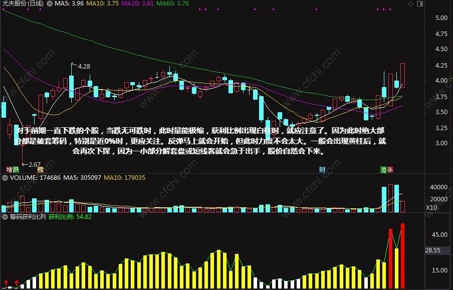 2、对于前期一直下跌的个股,当跌无可跌时,此时量能极缩,获利比例出现白柱时,就应注意了。因为此时绝大部分都是被套筹码,特别是近0%时,更应关注。反弹马上就会开始,但此时力度不会太大。一般会出现黄柱后,就会再次下探,因为一小部分解套盘或短线客就会急于出手,股价自然会下来。