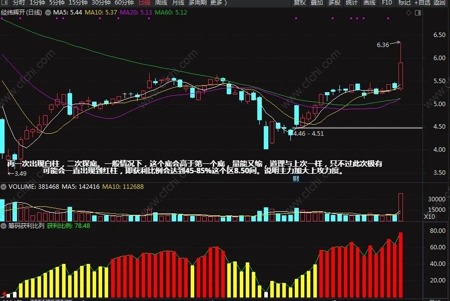 3、再一次出现白柱,二次探底。一般情况下,这个底会高于第一个底,量能又缩,道理与上次一样,只不过此次极有可能会一直出现到红柱,即获利比例会达到45-85%这个区间。说明主力加大上攻力度(可能是主力也被套)。