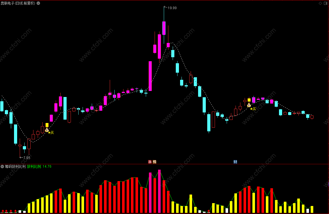 6、当获得比例由红柱转为粉柱时,说明强势上攻开始了,此时股价往往会出现大阳线,突破前面的压力位,而获利比例也开始在粉柱和红柱间不断转换。此时要坐等收益,做足这个波段,争取吃个完整的鱼身。