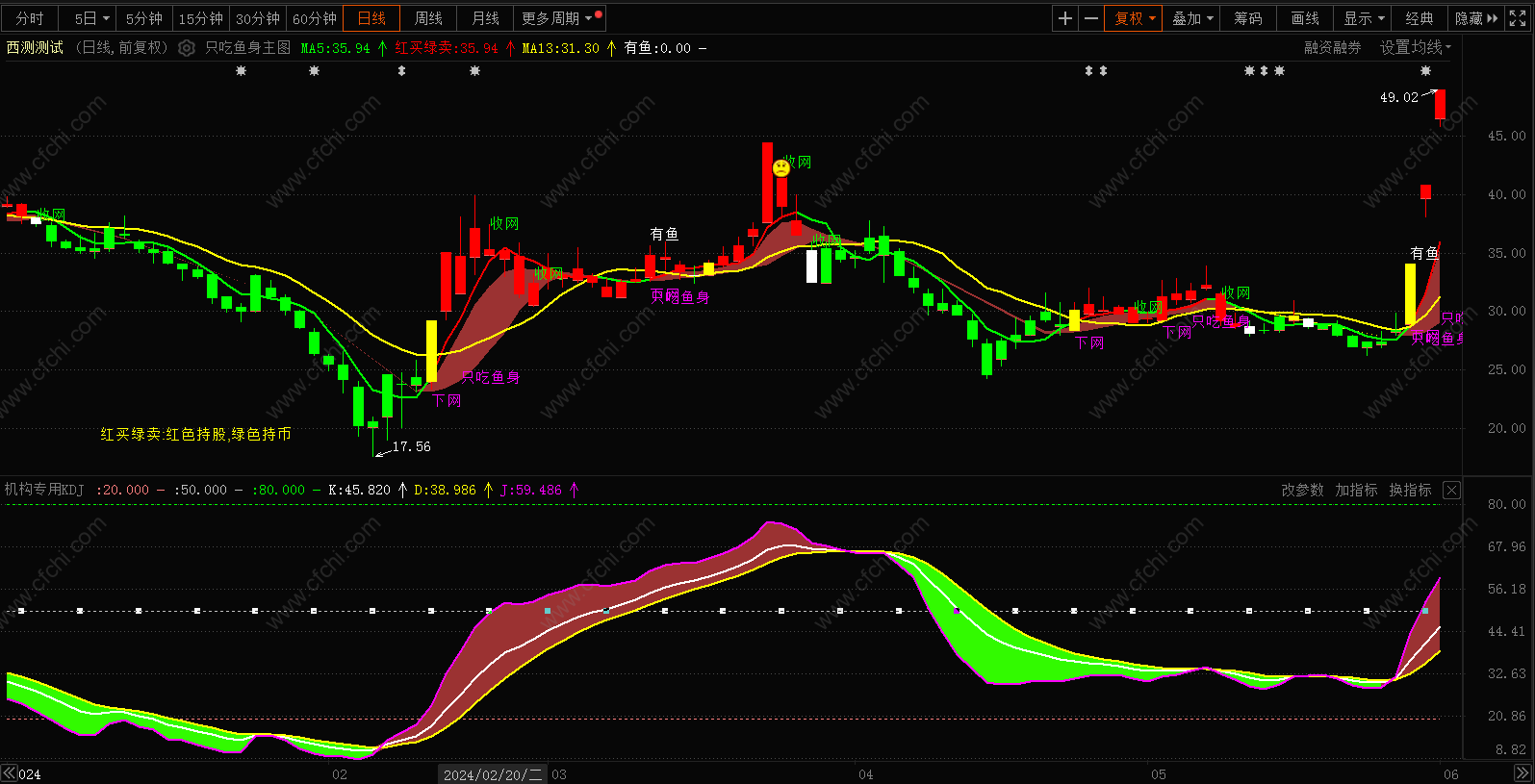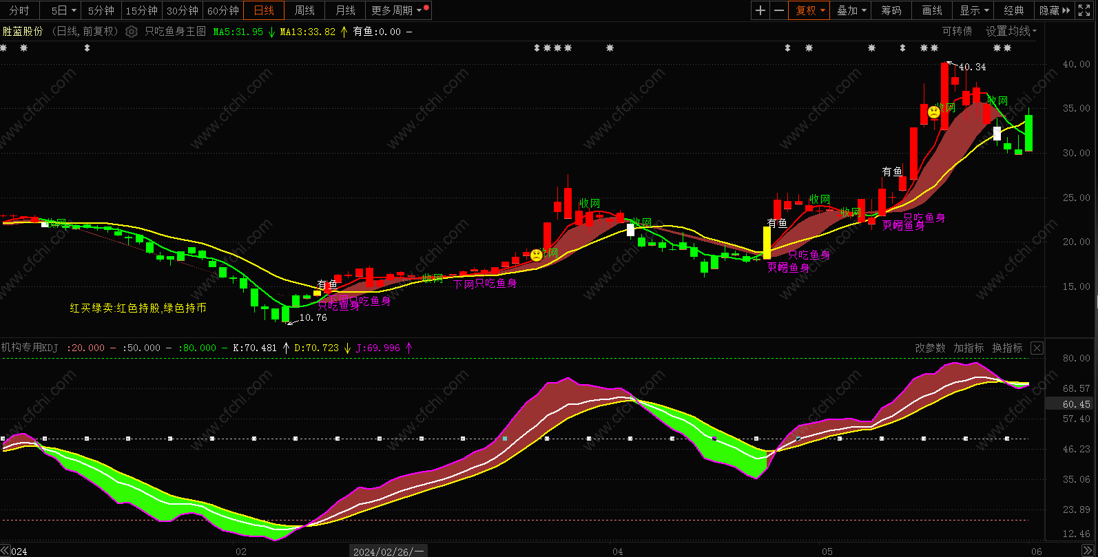 未优化参数前的KDJ是一个敏感指标,变化快随机性强,经常发生虚假的买、卖信号,使投资者根据其发出的买卖信号进行买卖时无所适从。优化后就可以过滤掉虚假的买入信号,找到高质量的成功买入信号,各周期的KDJ只要红色彩带出现就可买入持股待涨,简单明了。同时有底背离更好(价格创出新低而KDJ指标的J线低点却一波比一波抬高,这就是KDJ的底背离)。