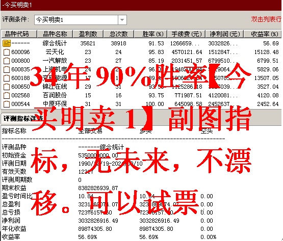 34年90%胜率【今买明卖1】副图指标,无未来,不漂移。【今买明卖】为系列指标分开售卖,使用通达信软件,系列里共分为【今买明卖】1,2,3,4四个指标,全部源码售卖,方便股友研究学习。所有指标不含未来,信号不漂移,购买后可做沙盘推演,所有数据完全真实,准确,不同版本软件数据可能略有偏差,安装后请先下载全部A股1990-2024年全部日线数据后再进行回测。