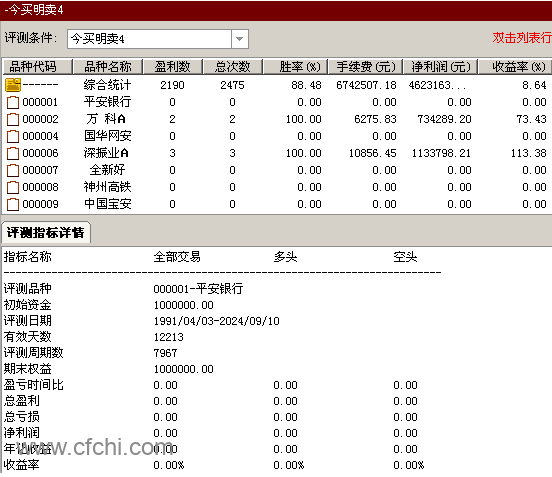 以上为【今买明卖4】34年全部统计结果,胜率为93.18%,总次数2711。下面我用自己做的程序条件对出信号的所有股票再一次进行统计实际完成一个点的总次数有多少。这是统计源码:真实完成1个点:REF(今买明卖4=1,1) AND (H-REF(C,1))/REF(C,1)*100>1;