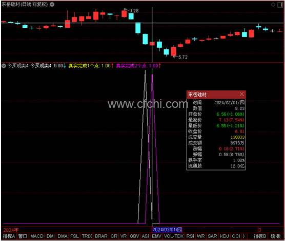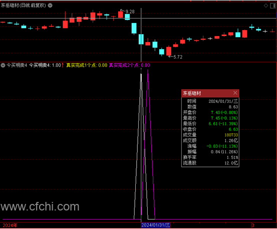 白色信号为今买明卖4的开仓信号,黄色和紫色都是用来测试一个点和两个点完成情况用的,只做测试。可以看出次日最高涨幅有7.54%,很香。因为上面说过实际上有87-88%的票要大于2个点,如何吃的到要看当天大盘和板块,这部分有运气成分的。2.1号那天大盘是跌0.64%,环境并不理想,这票开盘冲了一会没人敢跟所以又回落了。不过也算是很好了。
