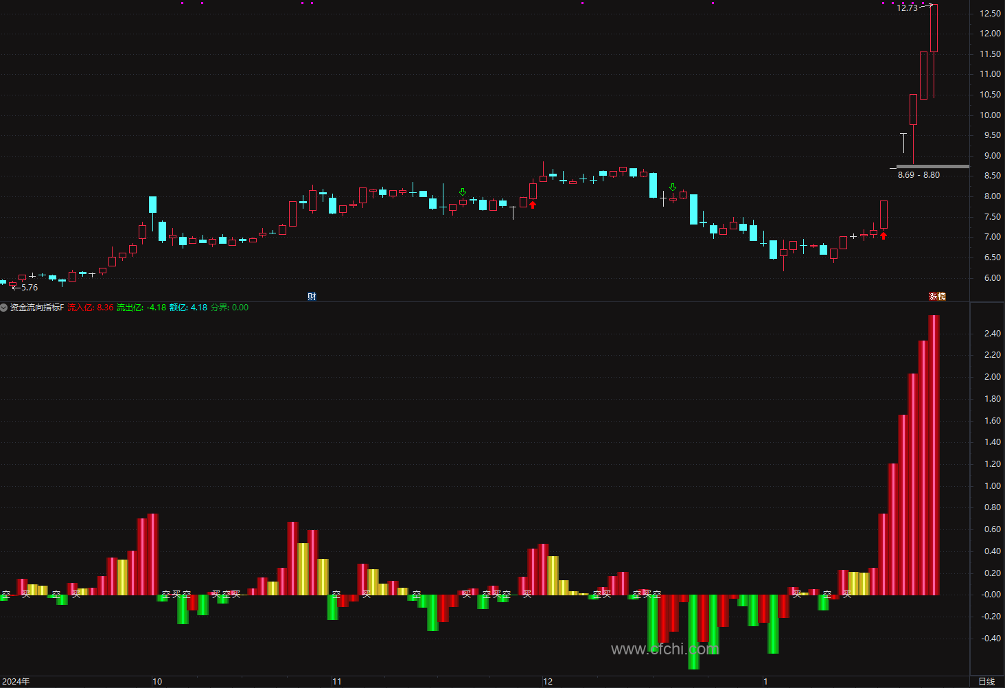 (通达信资金流向指标 无未来 供参考,副图给出了买空信号提示)
