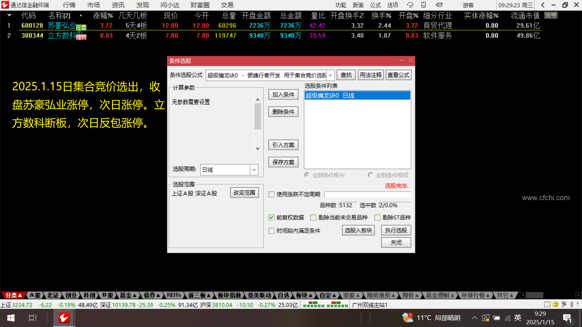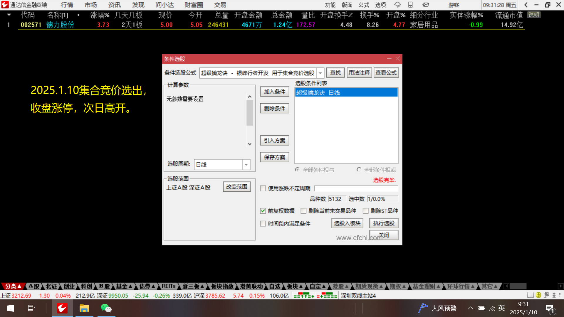 2.擒龙诀适合在电脑上安装了通达信的朋友选股使用,且可以在每天9:25以后的任何时间进行选股,省去了朋友们为选股而花大量的时间和精力。且可以在9:30开盘之前快速了解擒龙诀选出的股票,为交易提前提供参考。