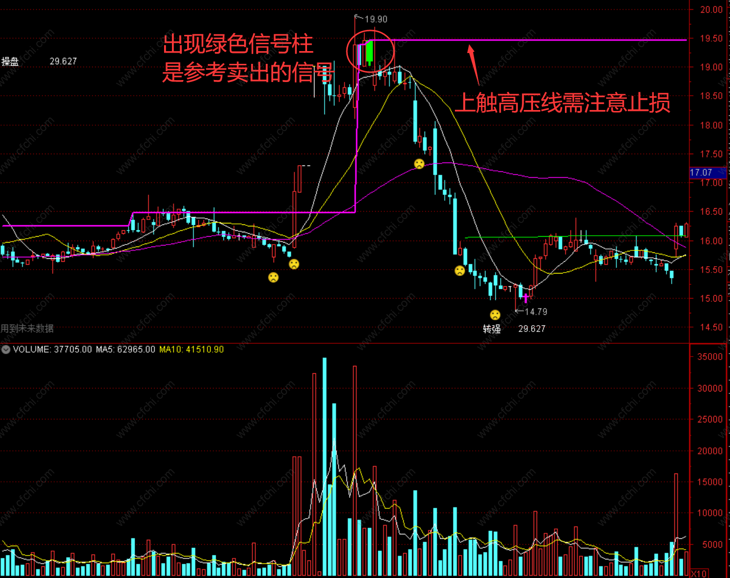 3、当K线上触高压线时需开始警惕,若不能有效突破,很可能会转为下跌趋势,注意设置好止损点,当绿色信号柱出现,是参考卖出的信号