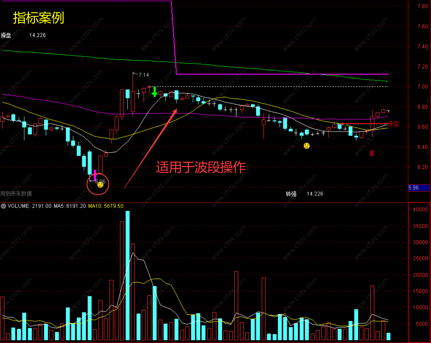 1、紫色信号线是高压线,B信号是参考买入信号,绿色信号柱是参考卖出信号