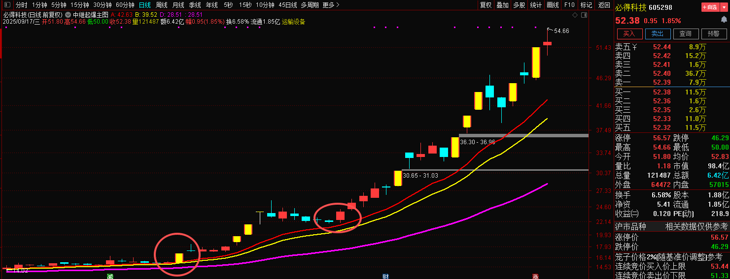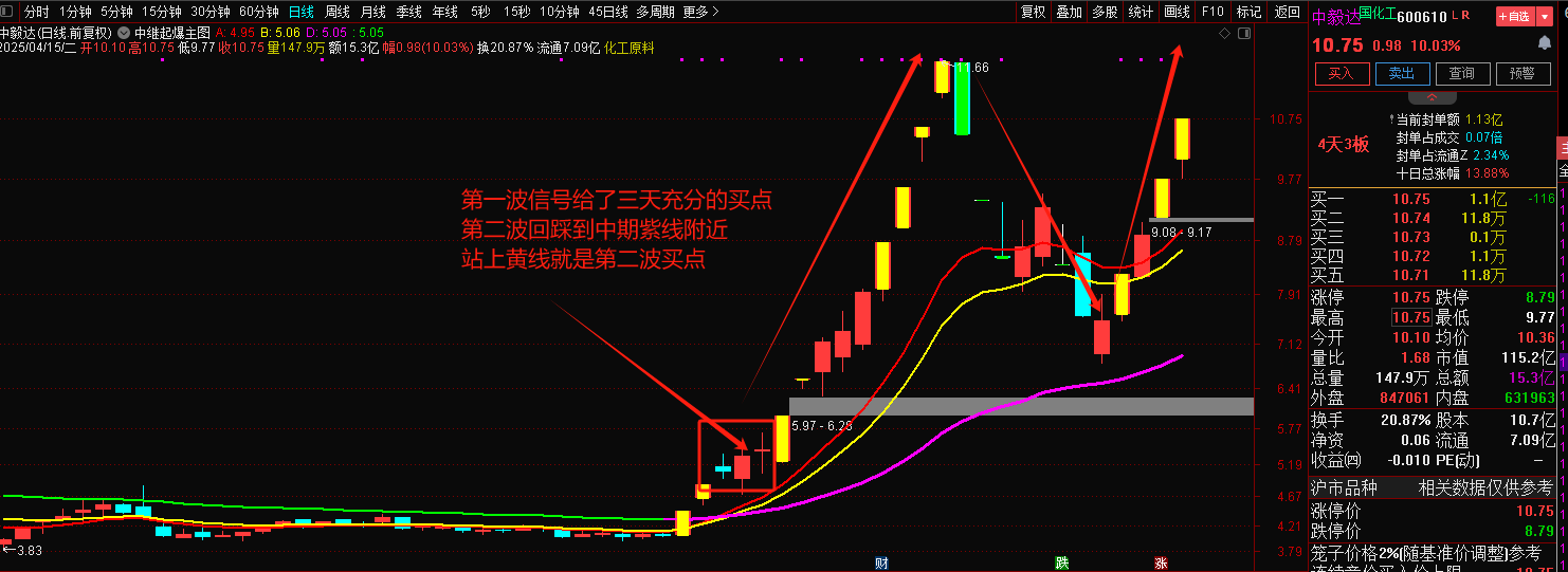 4、买入后缩量回踩红线、黄线不破位即是加仓点;