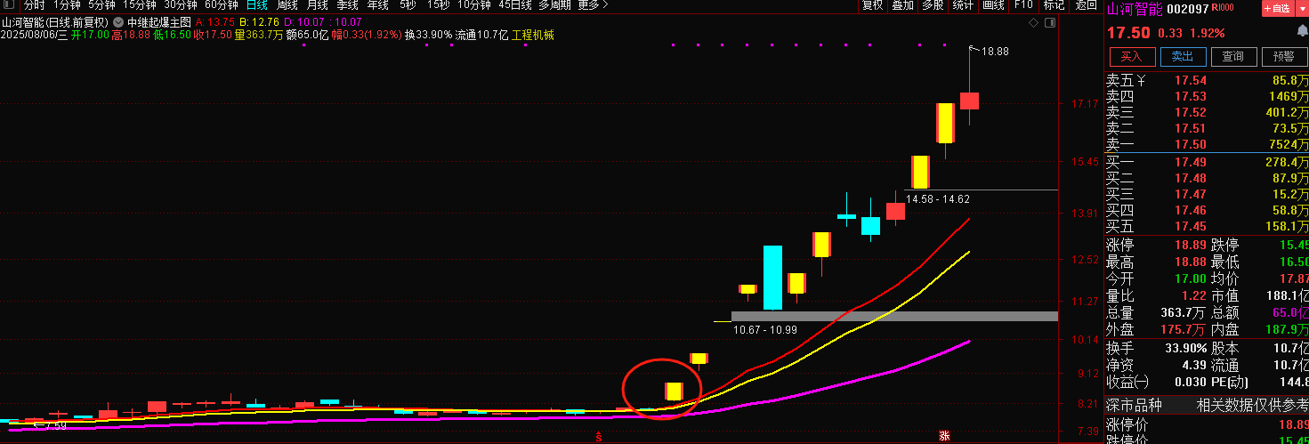 2、短期趋势线:红线和黄线,红线翻上黄线开始转强,跟踪关注,红黄线同时上穿突破洋红色线,为中继起爆买点(可选股);