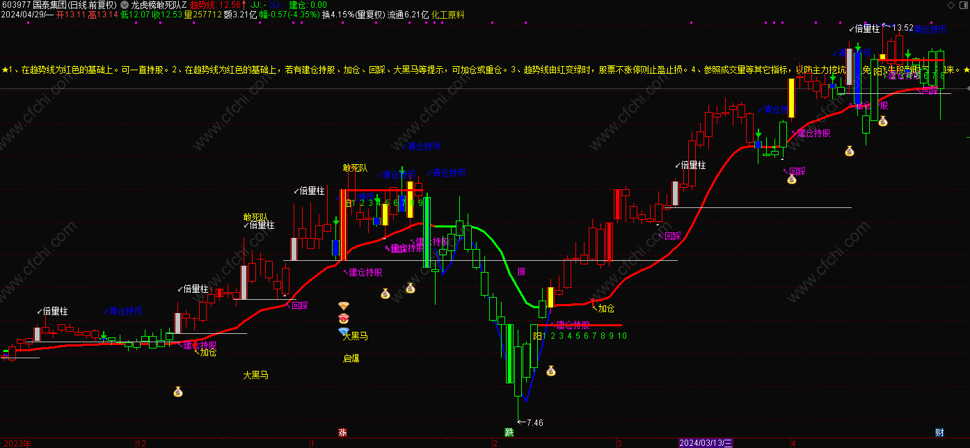2、在趋势线为红色的基础上,若有建仓持股、加仓、回踩、大黑马等提示,可加仓或重仓。