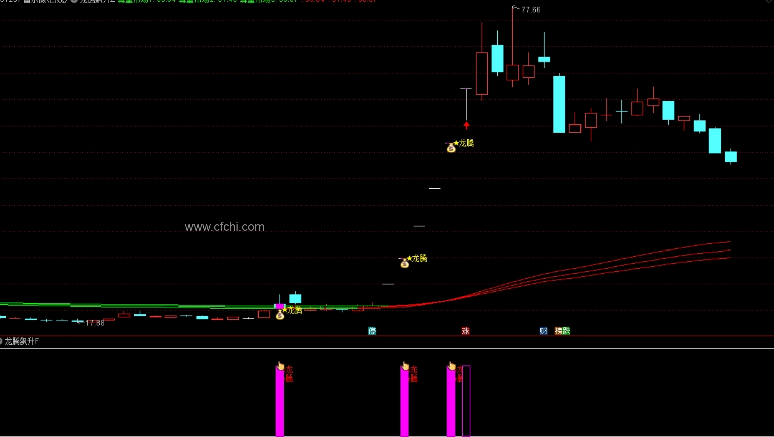 7、当所有这些条件同时满足时,认为这只个股可能是短线龙,此时会出"钱袋子-龙腾"信号。