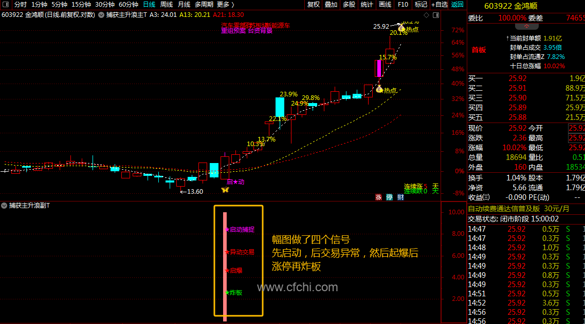 指标融合了多种分析功能,包括启动捕捉、异动交易、起爆信号、连涨天数、