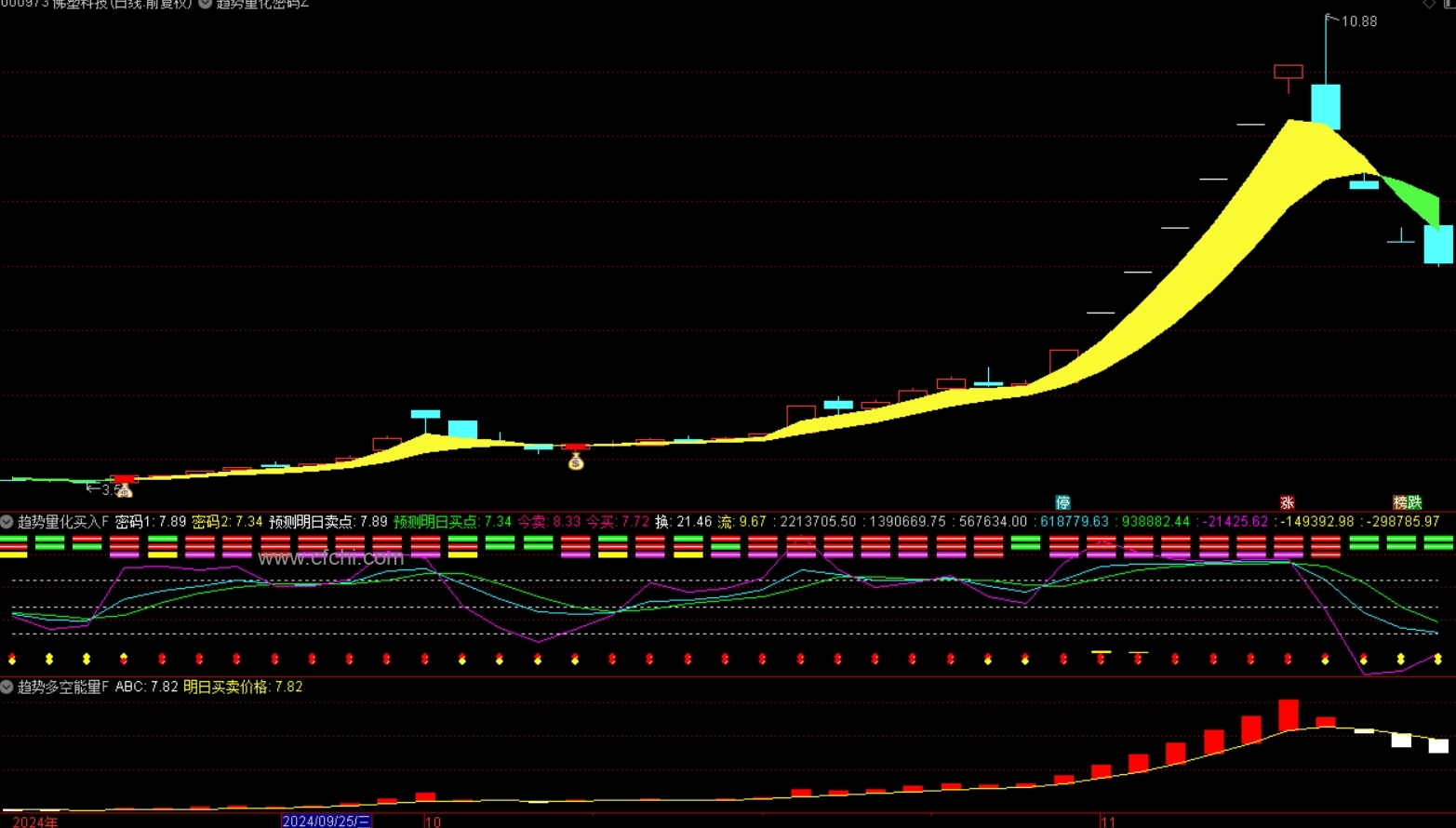 注意:趋势量化买入副图用到成本分布、流通股本等函数,对信号无影响,可放心使用,不喜勿选!