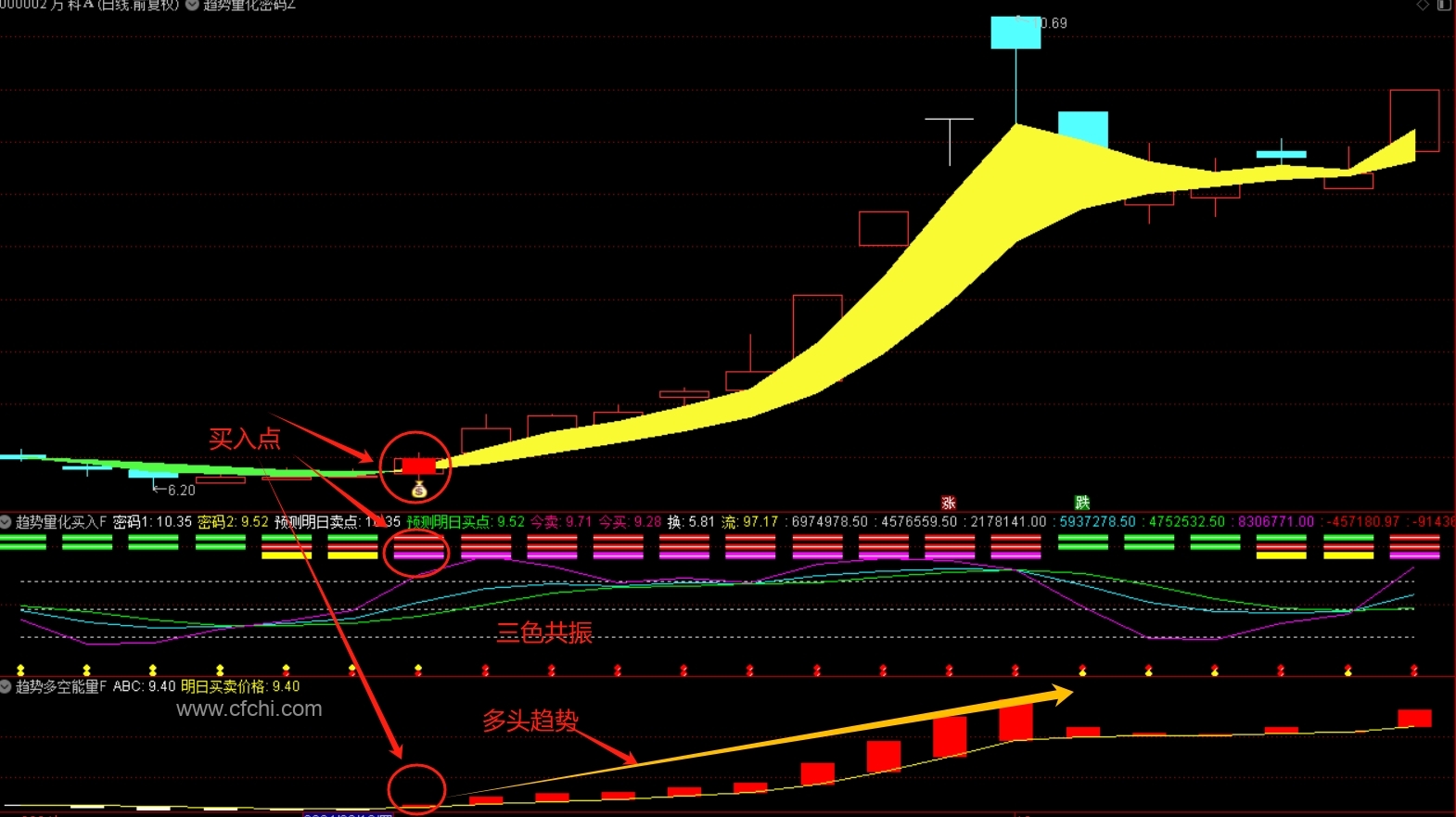 5、主图红色K+黄色丝带+多头红柱+红红紫+金叉多头+底部红点出现"=共振买点。