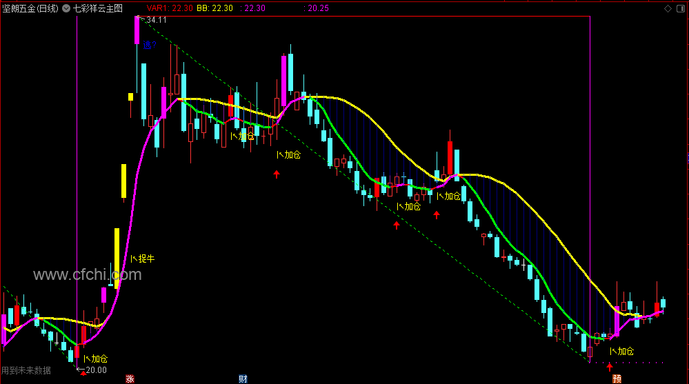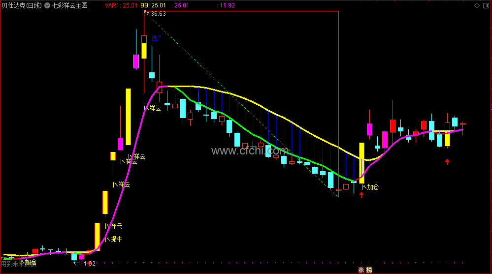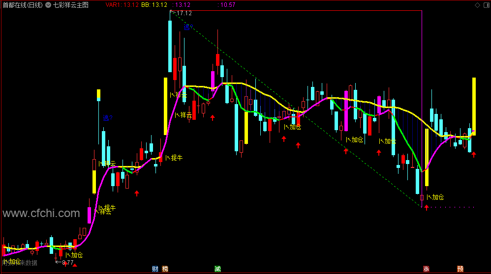 七彩线条: 黄色、绿色、紫色等不同颜色的线条代表股价运行的不同阶段。
