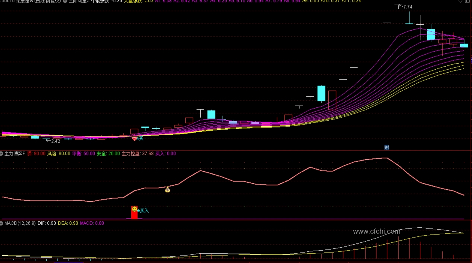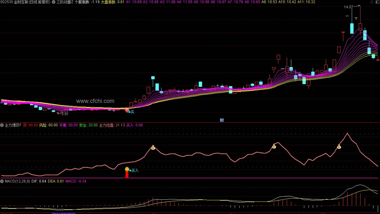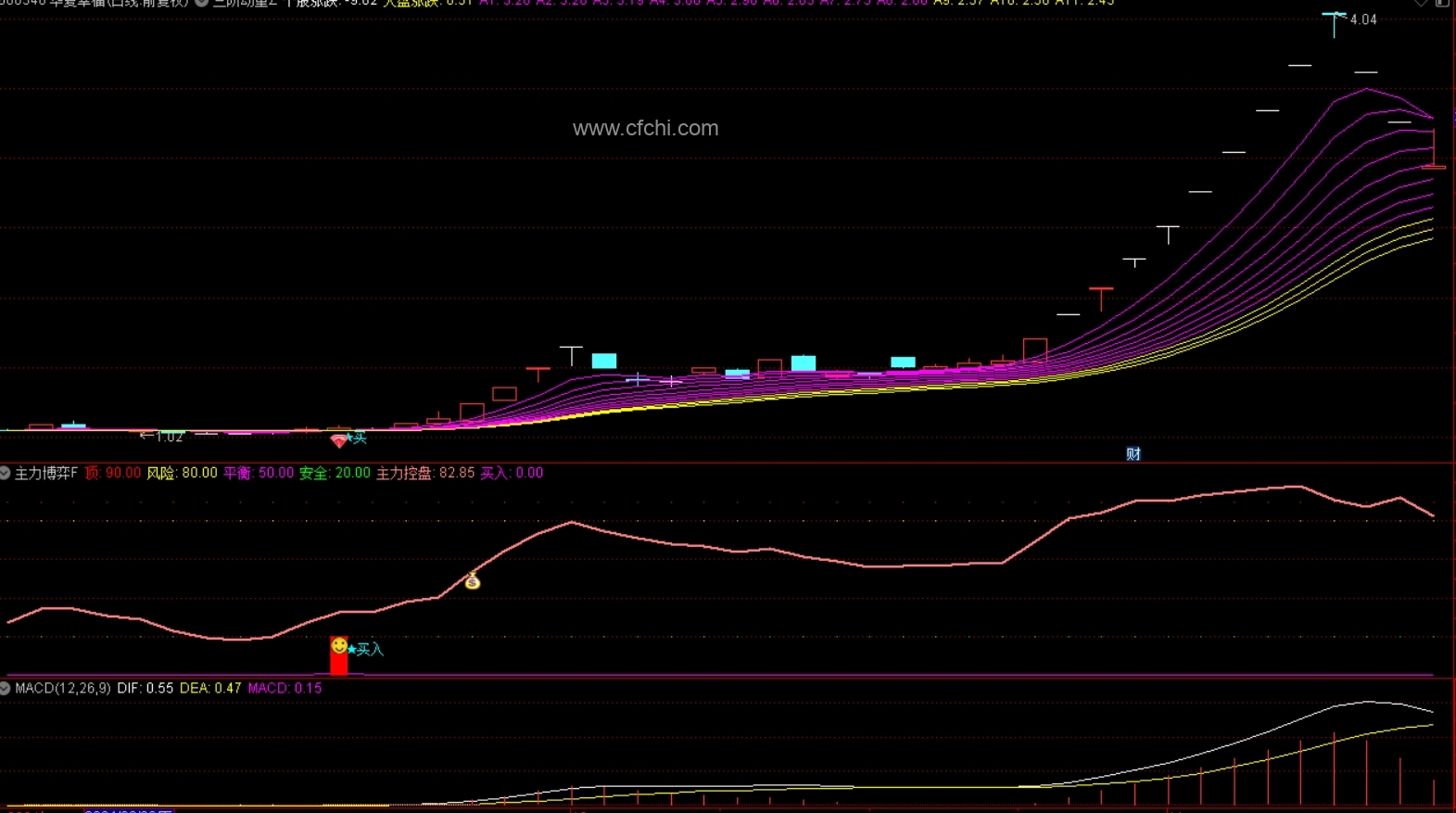控盘力度: 主力控盘,以粉红色粗线显示,数值表明主力占据的优势,显示控盘力度>50时以"钱袋"信号标记。