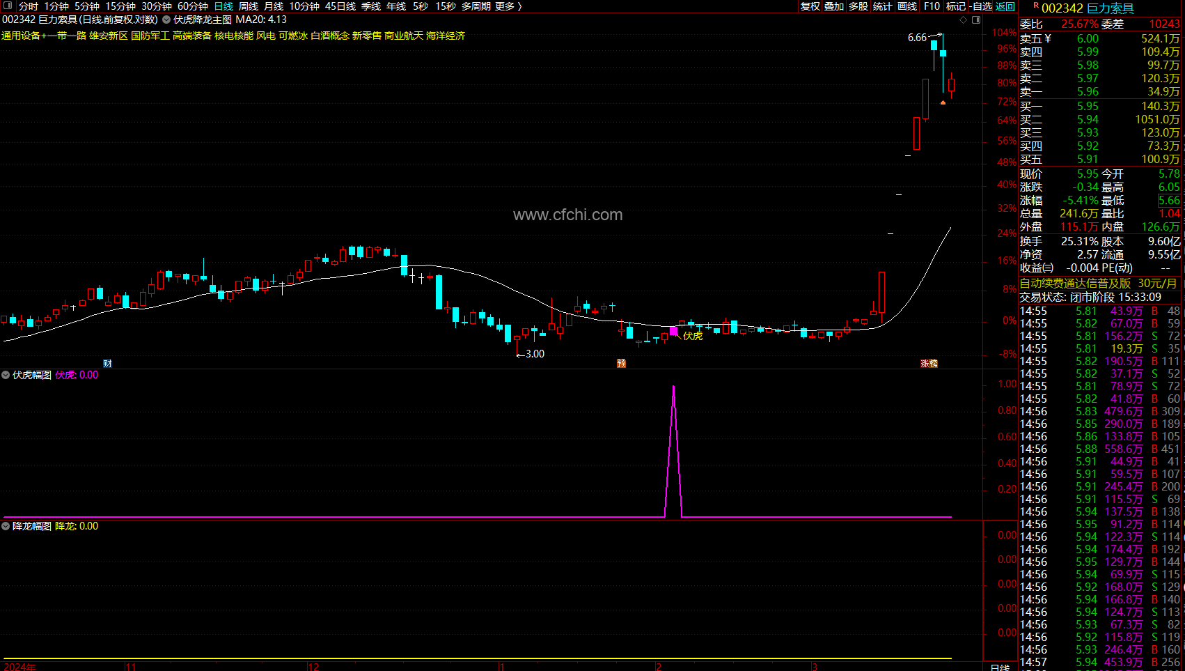 1、伏虎幅图:运用到开盘价低于5条短期均线,收盘站上5条短期均线,及红色动能和资金流入时,主图幅图