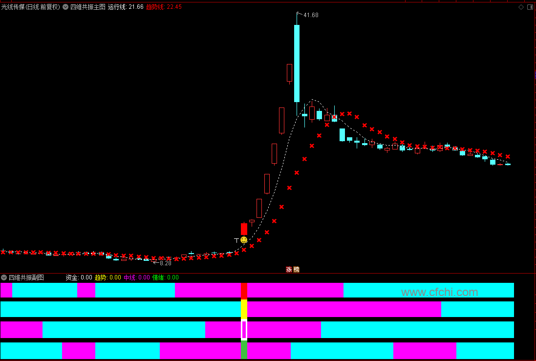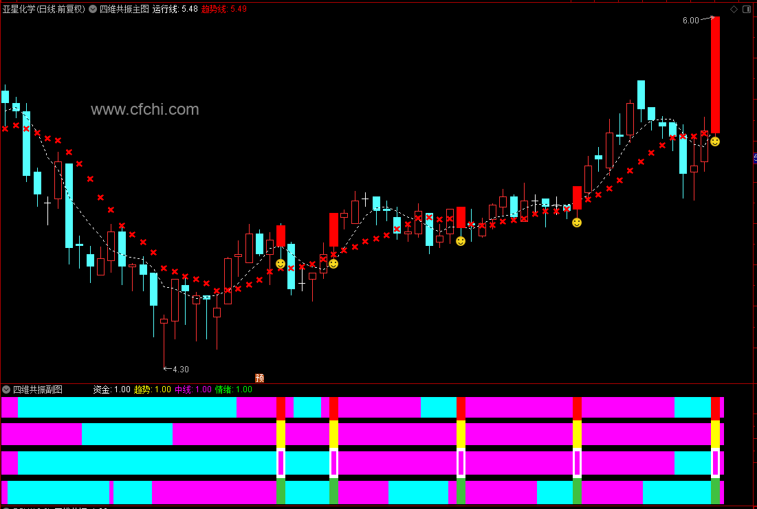 使用"资金+趋势+中线+情绪"四维研判模型,通过紫红、青状线与"笑脸"图标实现多维共振,该指标通过多维量化模型构建,将复杂的量价关系转化为直观的颜色信号,特别适合中短线波段操作。