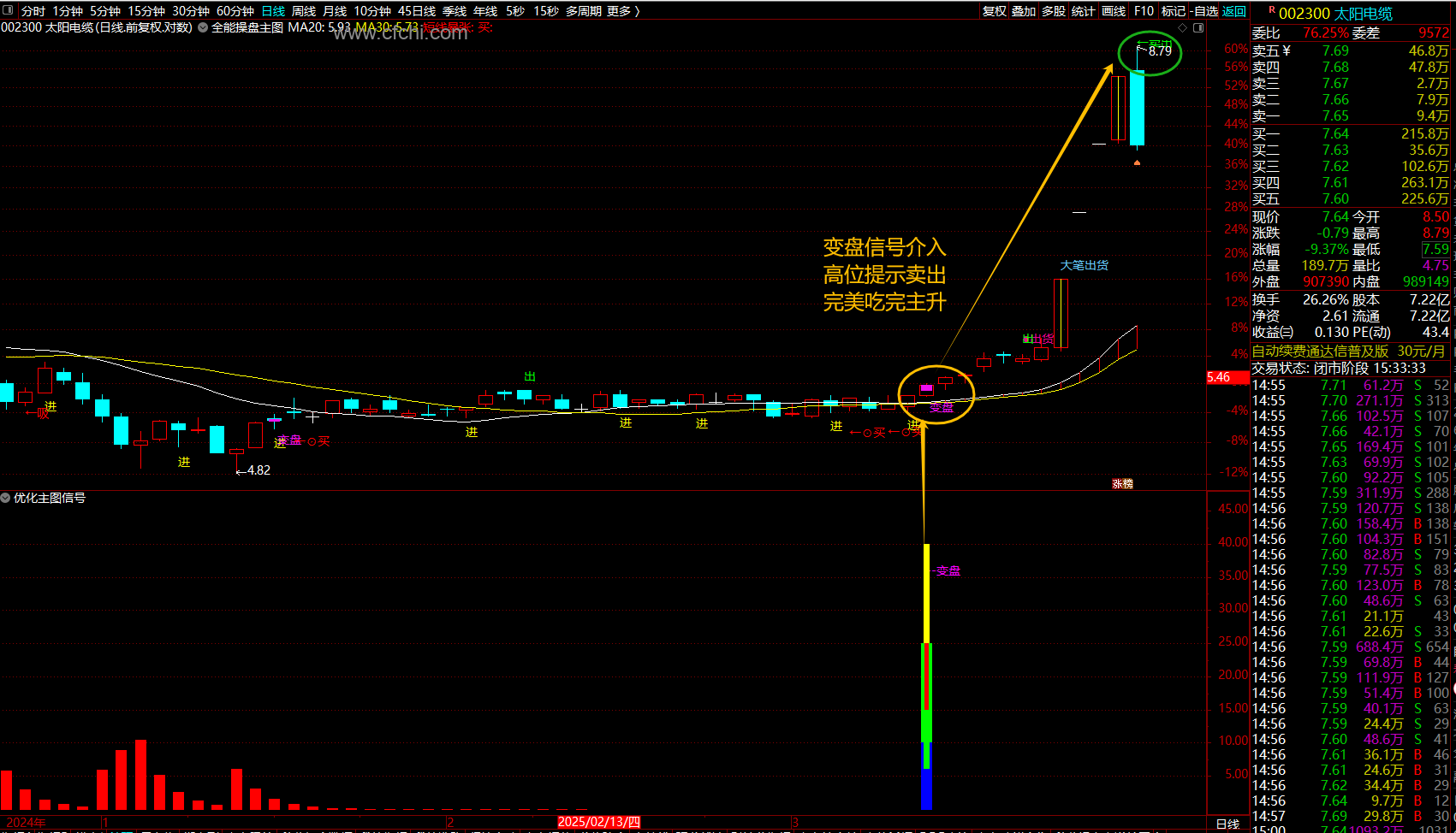 2、变量选股指标,选出股后,对应主副图要有变盘信号后,方可参与,没有信号根据自己经验决策。