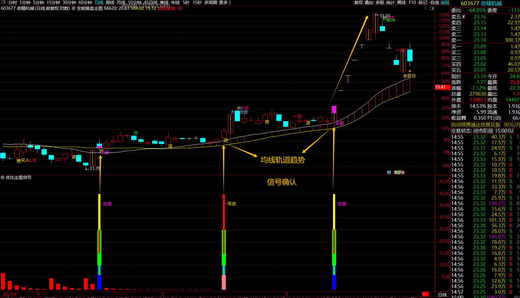 当20日均线(MA20)和30日均线(MA30)像铁轨一样向上张开时,这时出现信号闭眼跟。