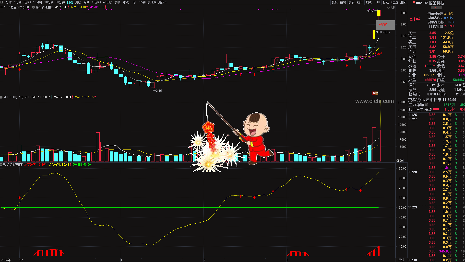 副图指标:红色柱状图显示游资介入强度,当数值超过80时表示强势
