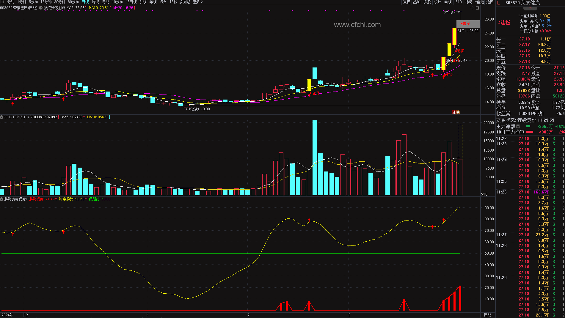主图指标:显示5/10/20日均线,涨停板用黄色柱状标记,主力资金介入时显示红箭头