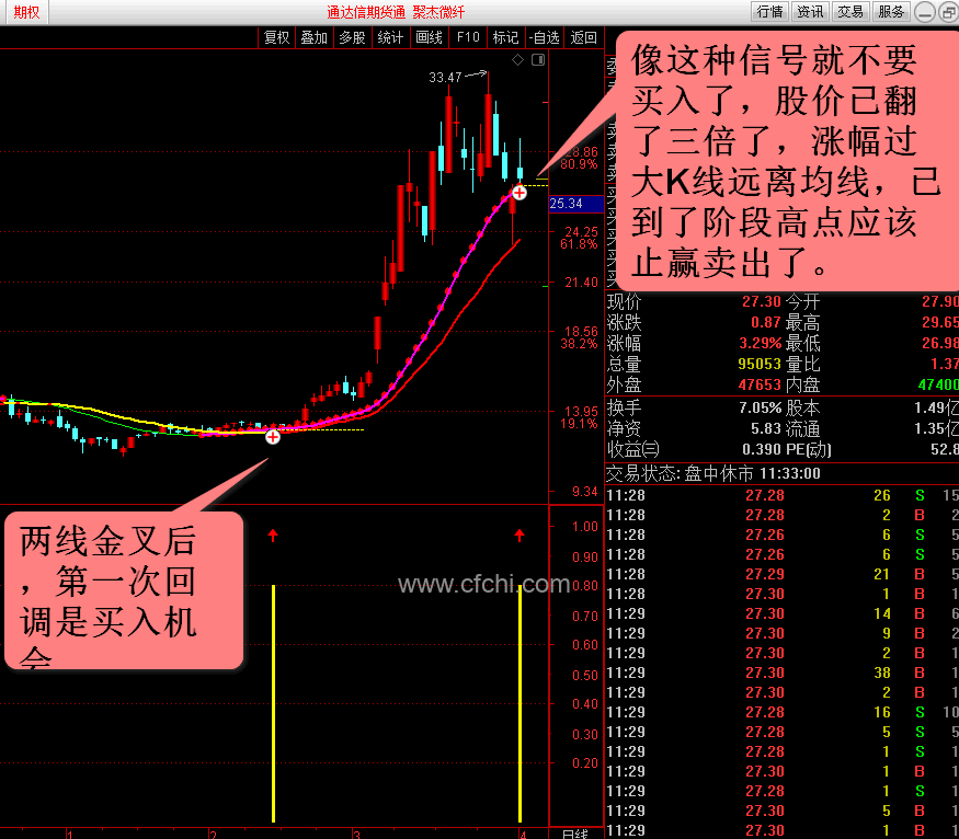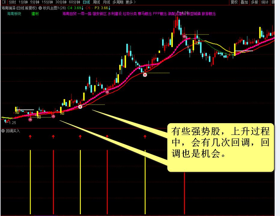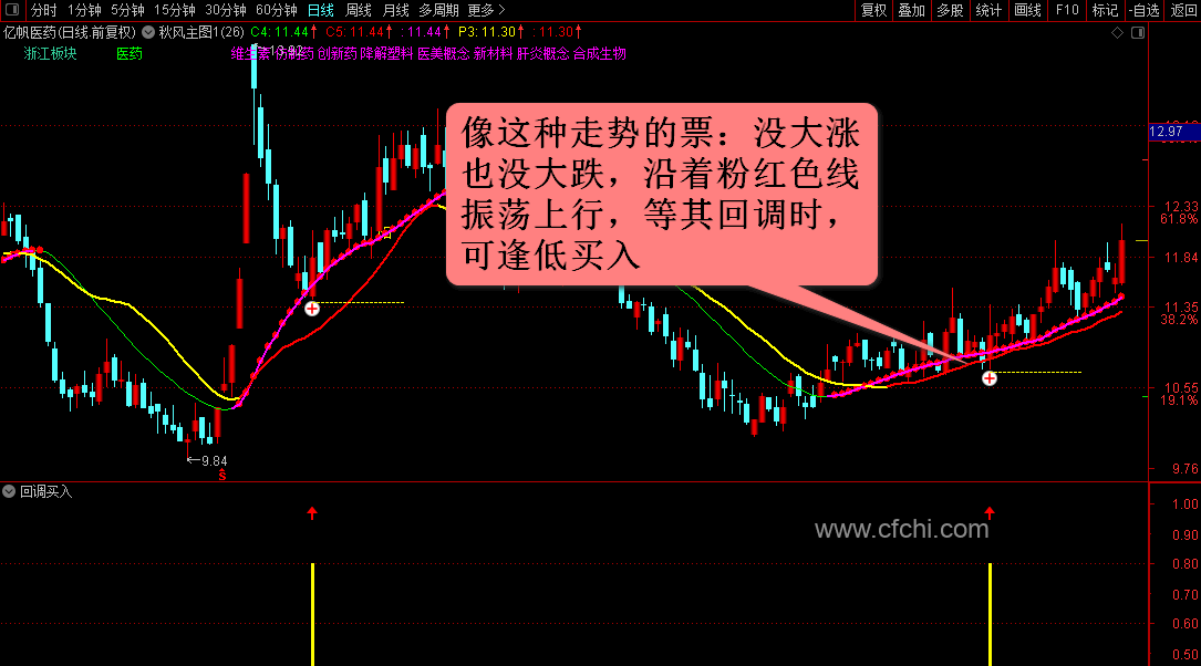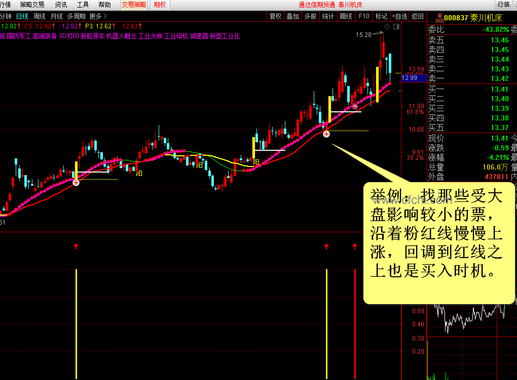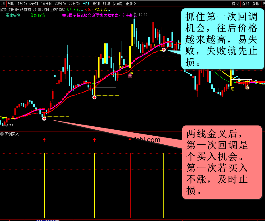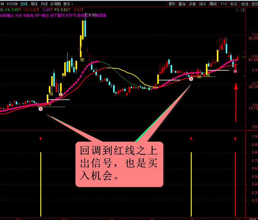 2:本指标所说的回调买入是指,主图上的粉色线上穿黄色(或红色)线,上涨几天后,出现回调,此时粉线仍然向上,红线也向上,再结合公式里的其它几个条件而出的信号,适合在上升途中回调买入,特别是一些强势股,出信号也是买入机会。
