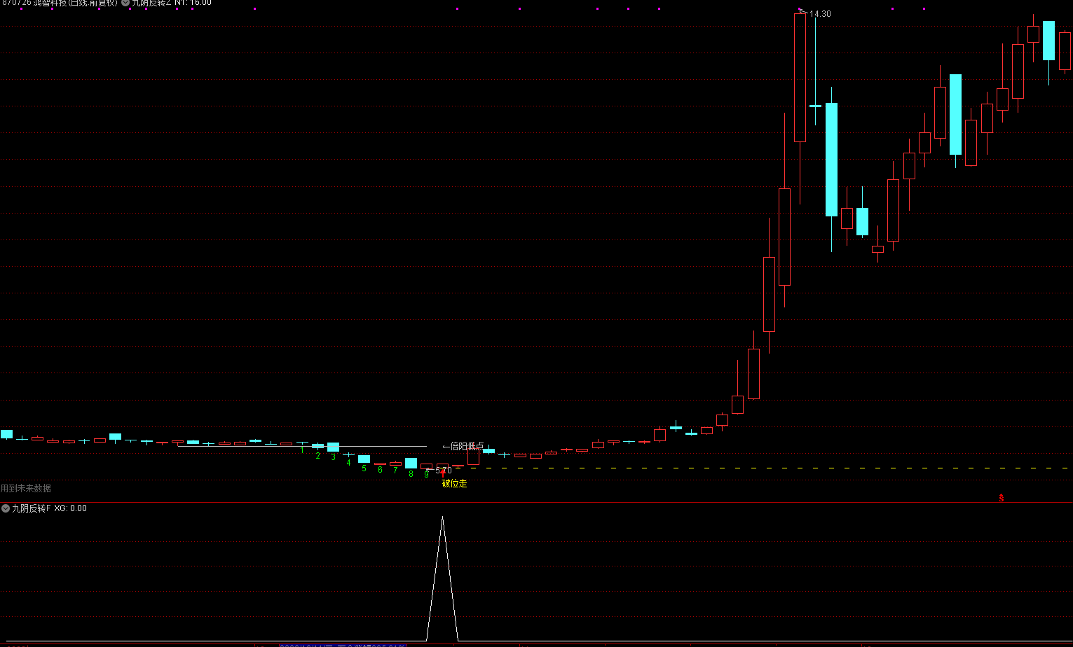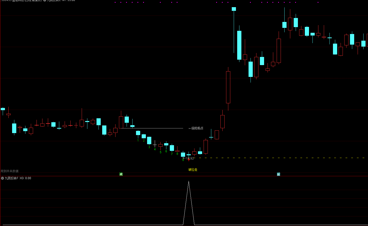 红色向上的箭头,是九转次日,黄色水平虚线,是九转次日最低点的水平画线,黄色文字提示“破位走”,就是破了黄色虚线要离场的意思;