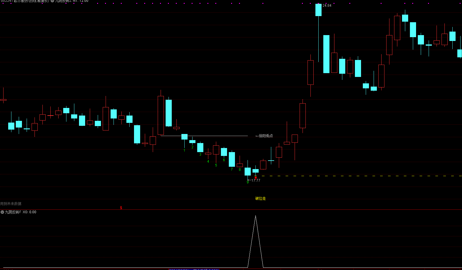 这是因为,倍阳+下降九转,我们认为是建仓后洗盘,如果是持续下跌,就谈不上建仓,因为建仓往往会逆势抗跌,起码也是横盘,而如果前面没有横盘,那么后面出现的倍阳+下降九转就是虚假信号;