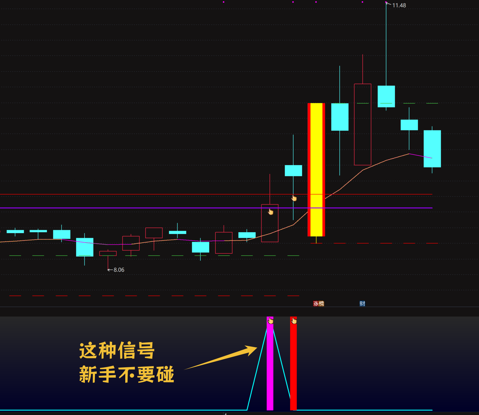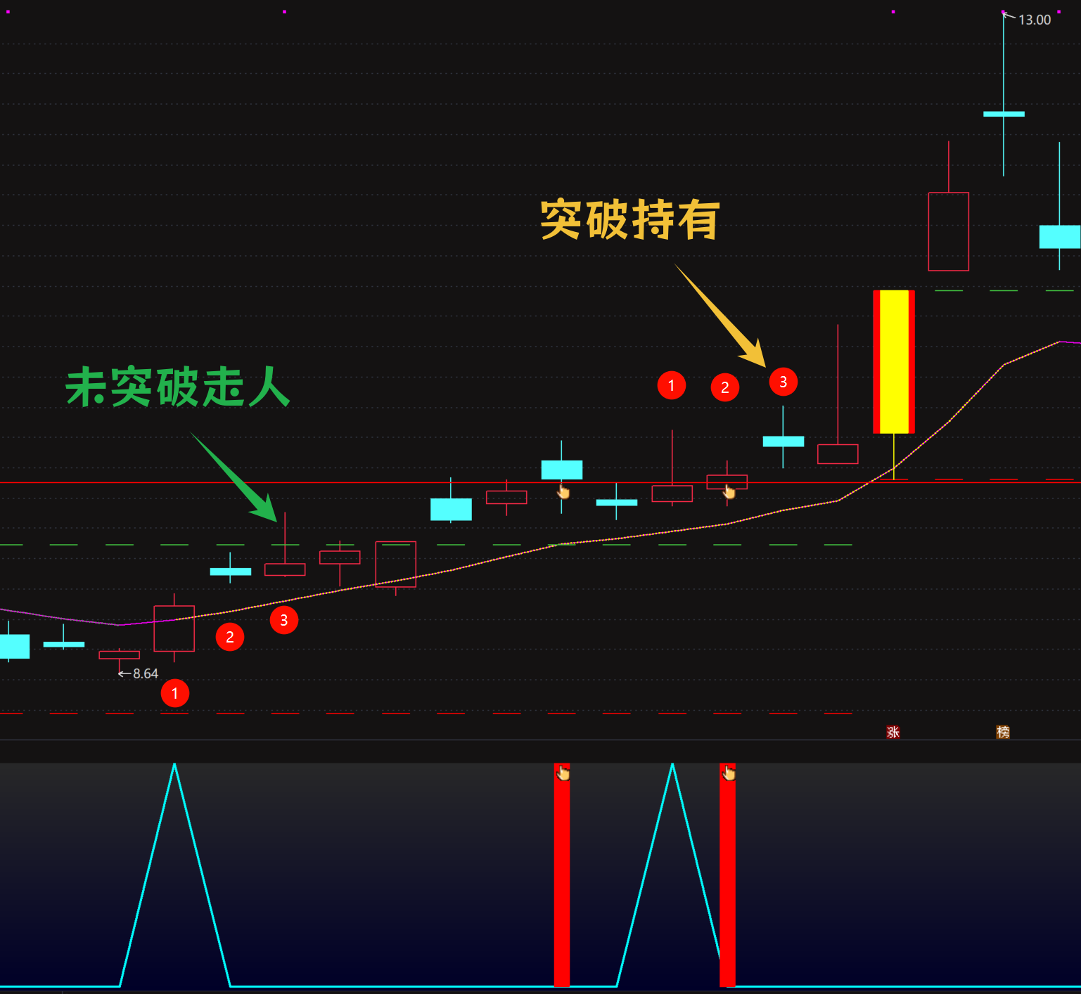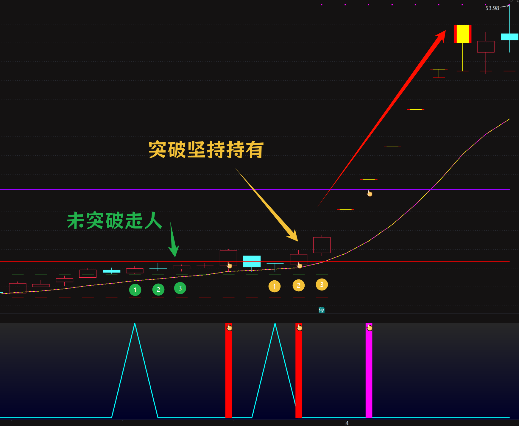 秘线金指信号:当价格穿过“起拔金指”或“秘线金指”时,发出信号。