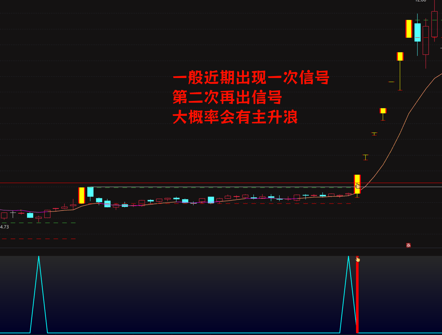 双金指共振信号:当价格同时穿过“起拔金指”和“秘线金指”时,发出强烈信号。