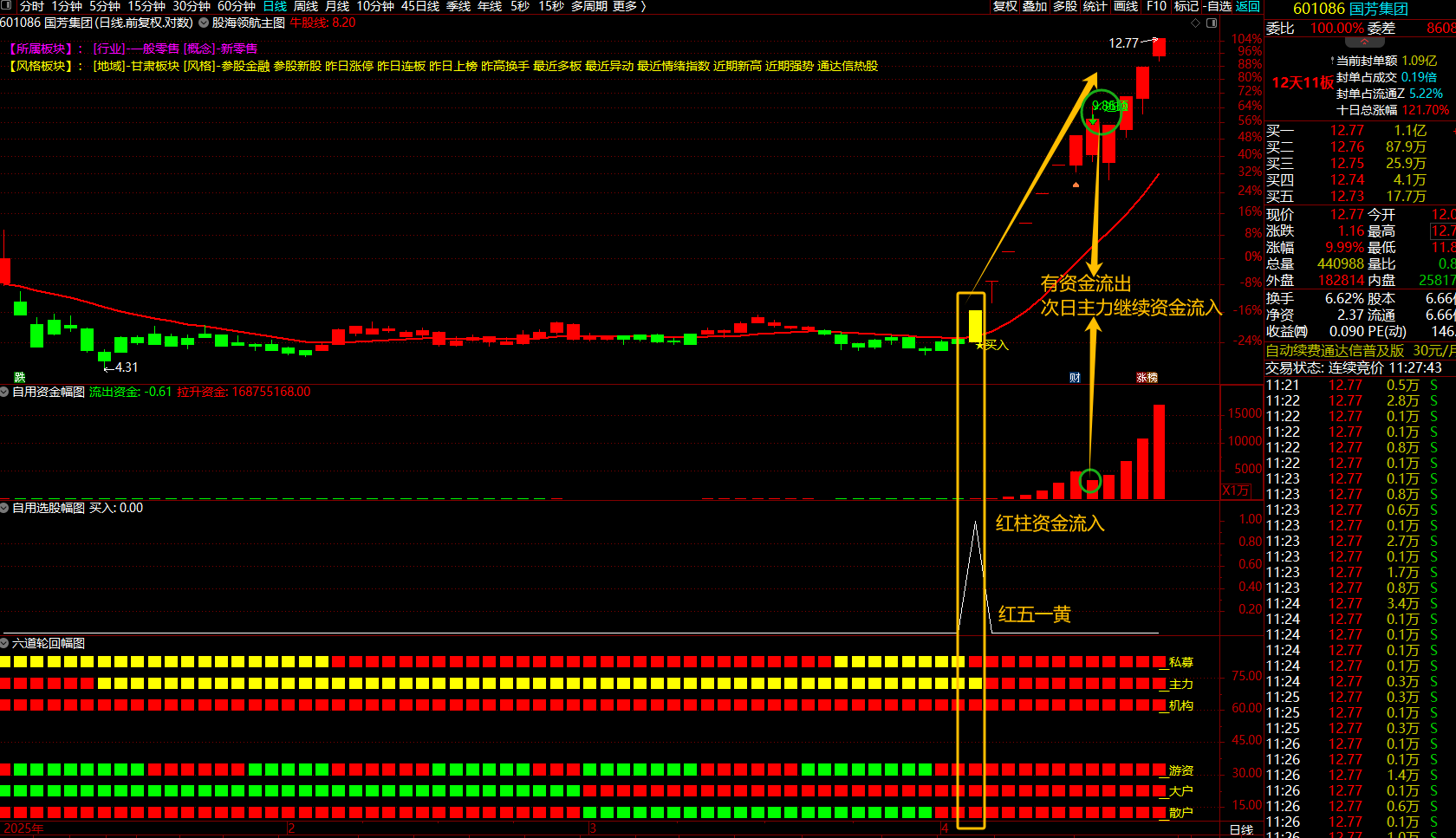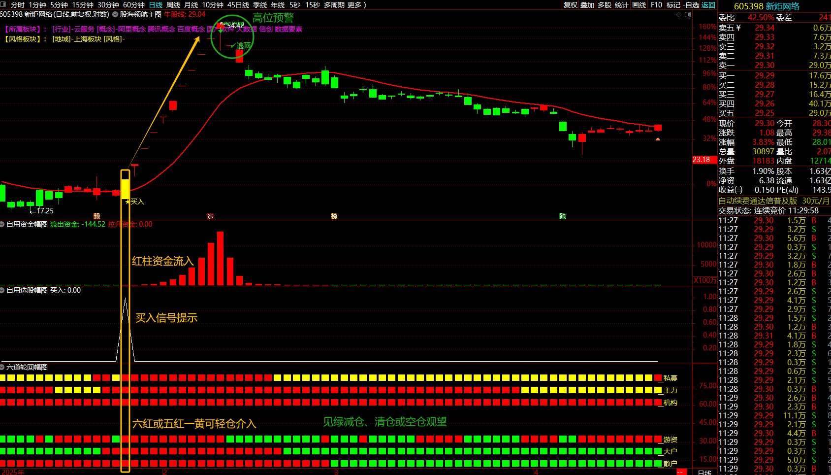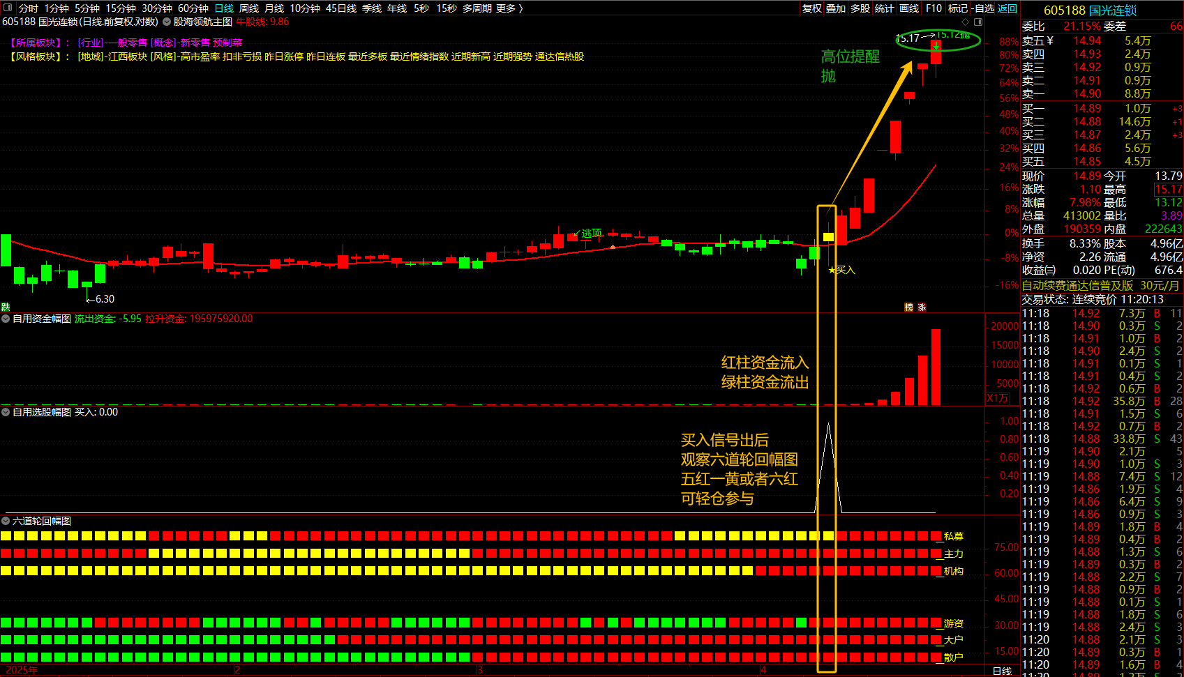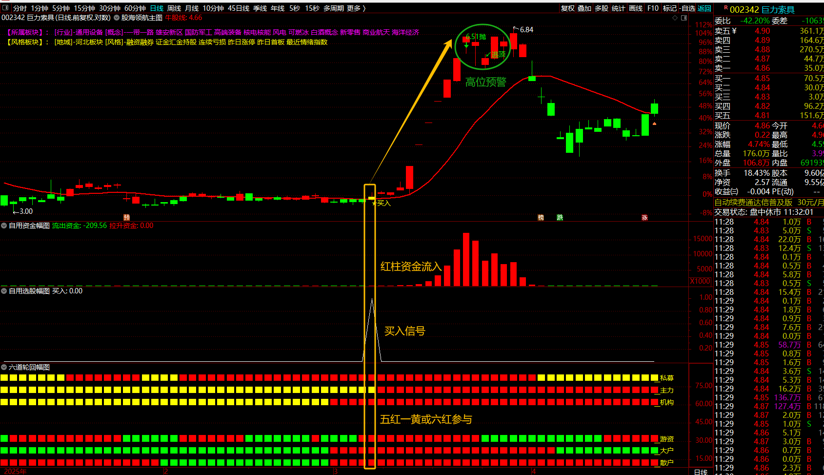 3、 当自用选股发出买入信号时,观察六道轮回幅图,必须满足六个红柱或五个红柱一个黄柱条件,