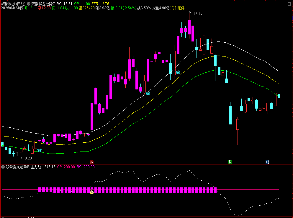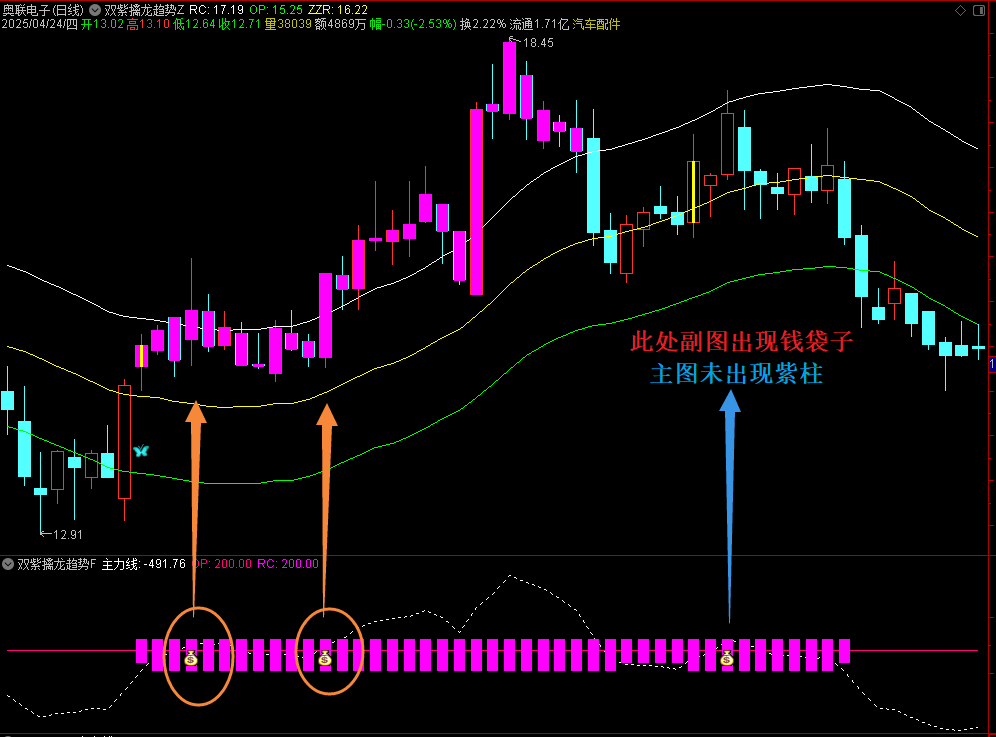 - 紫色K线:主图与副图双紫共振,代表主力资金持续介入;