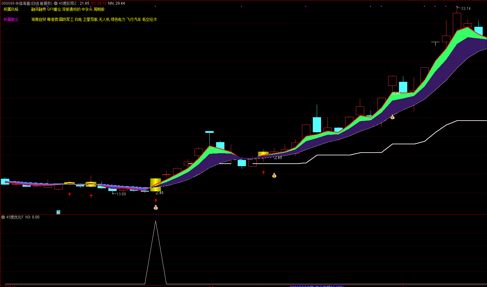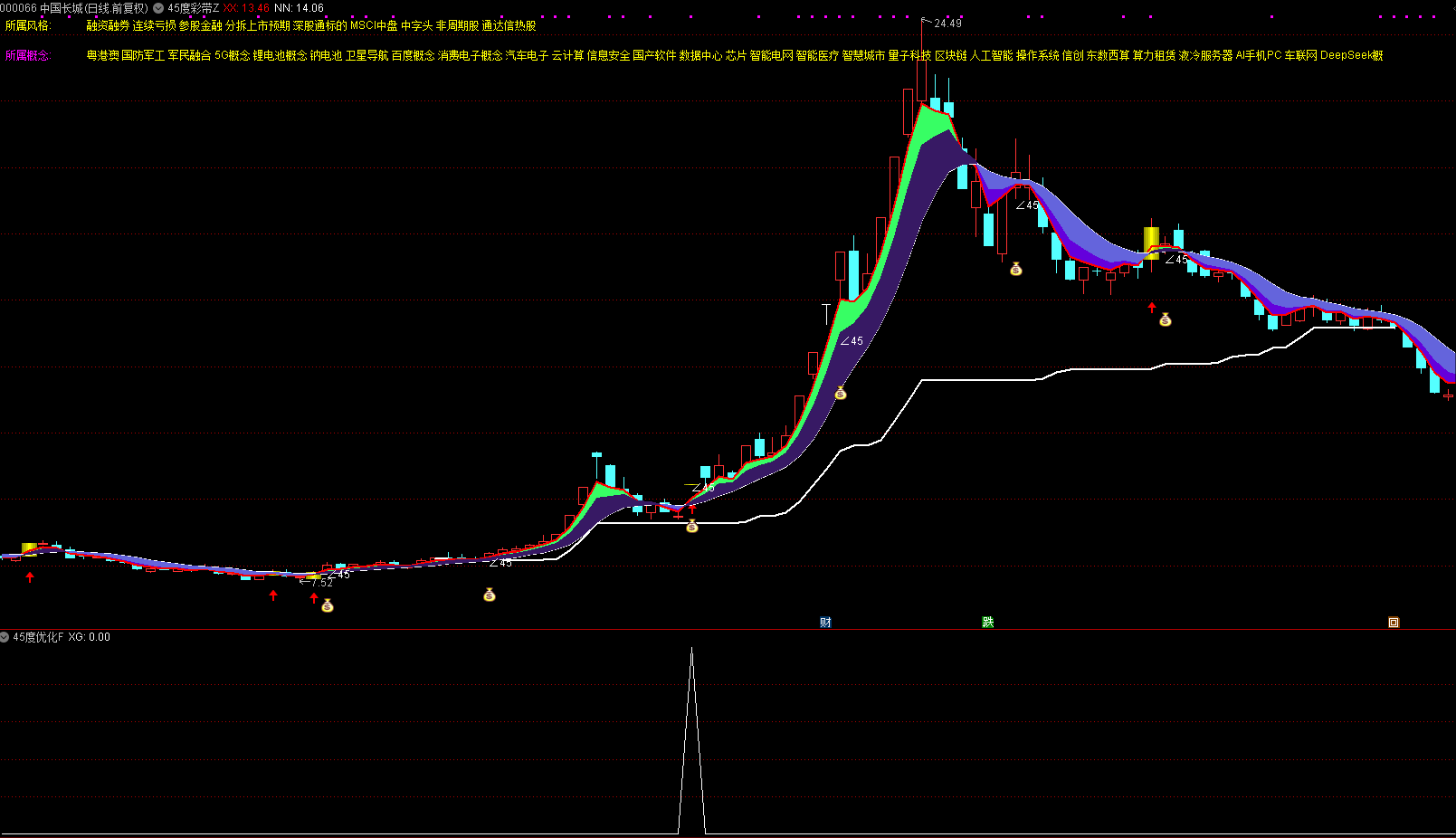 (通达信 【45度上涨彩带】 1主2副2选股 45度角上扬抓强势股 )