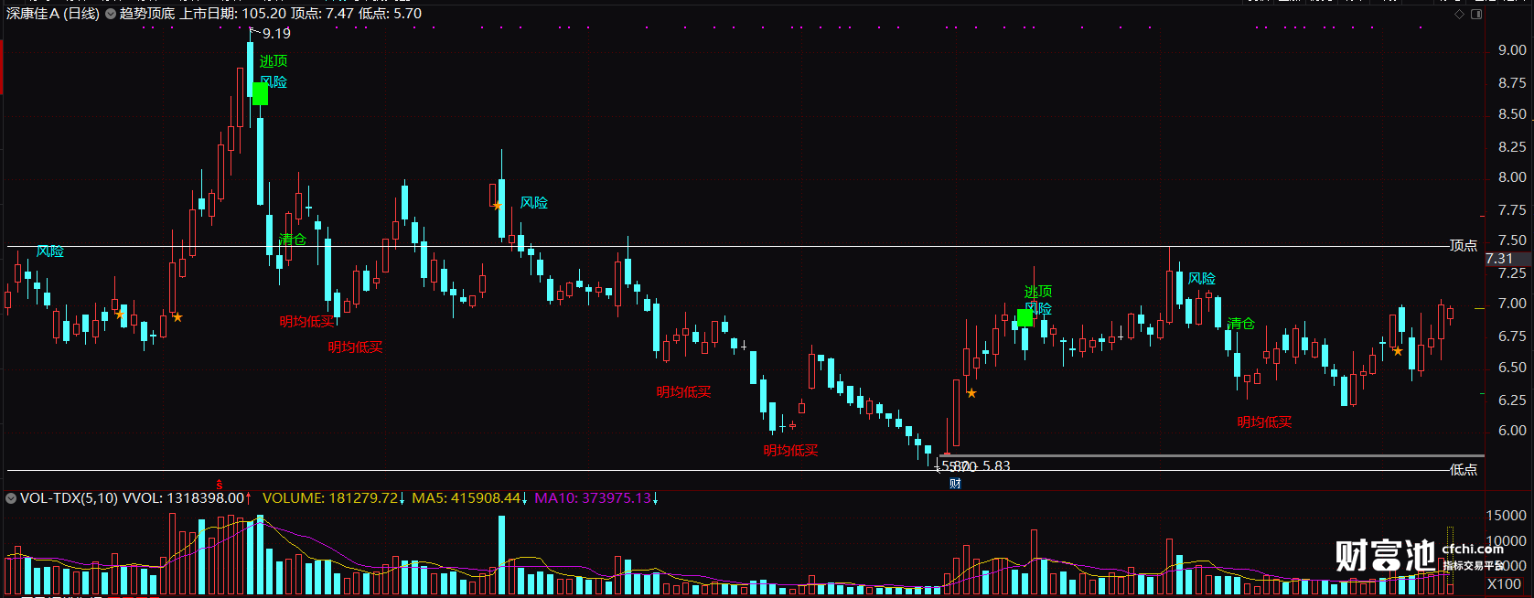 当我们看见K线图上出现“☆”或者“明均低买”提示,这时刚好是位于低位,代表着接下来后面股市会涨,这时我们可以考虑买入股票,当我们看见K线图出现“风险”提示就是注意减仓,出现“逃顶”坚持抛出,弃股持币,时刻要记住这句话——低位买入,高位卖出。
