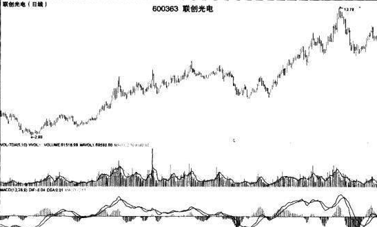 高位盘整指个股在1年以内已有一倍以上涨幅后,发生在高位的整理。该种盘整即使突破,上升空间也较为有限。一般来说,一年中很少有个股可以维持两倍以上的绝对涨幅而不进行调整的。例如,联创光电(600363),在2008年大底后的行情中涨幅高达300%以上,2009年下半年一直维持高位横盘,在今年的行情中,虽然仍有表现,但去年行情中的大幅度上升宣泄了过多的多头能量,制约了其在短期内进一步上升的力度,升幅仅为50%。如下图所示。同时,高位盘整后再继续升势的能力与流通盘的大小也存在一定关系。