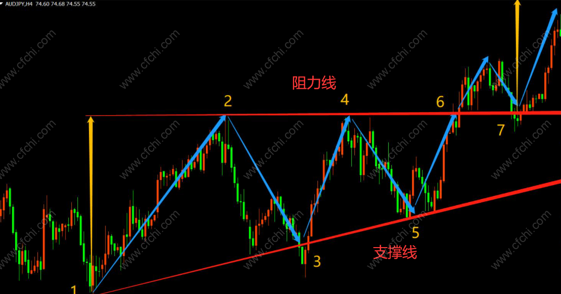 上升三角形是由一条水平线和另一条斜线相交而成的直角三角形,如图下: