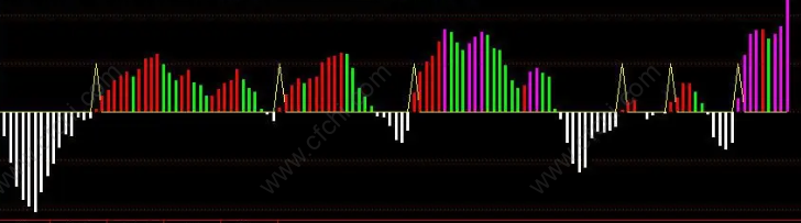 5、绿柱:当庄家拉升到自己利润充沛的时候,将会开始逐步在高位考虑出货,于是紫柱就逐步转换成绿柱,表明主力开始出货。我们一般通常认为,紫柱的出现意味着一波行情即将面临尾升,也就是意味着,我们要开始卖出手中筹码,因为后面这个阶段就只剩下最后一个步骤:出货。一旦紫柱消失转换成绿柱,即迅速卖出。