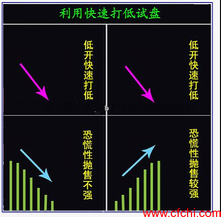 4)低开后快速打低。开盘低开后,主力通过快速打低股价的方式试盘,目的是判断盘中恐慌性的抛压意愿是否强烈。请看下图:
