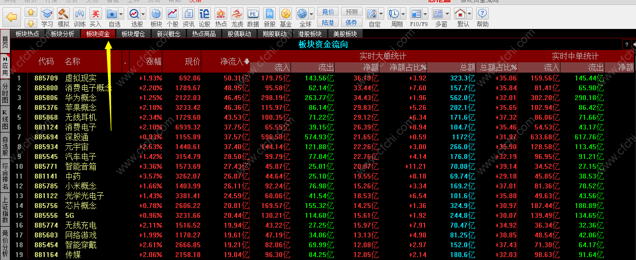 点击“板块资金”可以看到各个板块行业的资金流向。