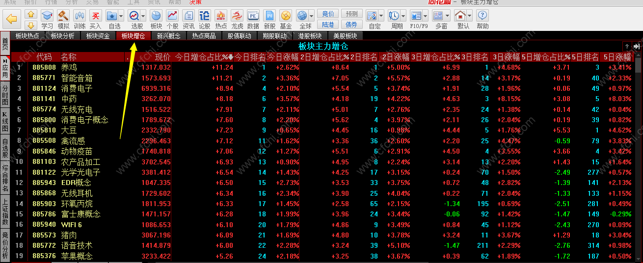 第一步:打开同花顺上面的栏目中直接就有“板块”这个栏目,直接打开之后选择“板块资金流向”就可以看到主力资金对个股的流入和增仓情况;
