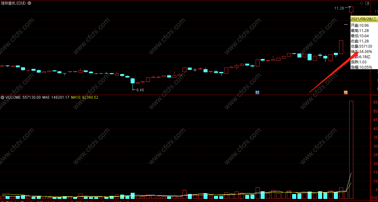 5、股票换手率较高一般是伴随着利好的现象。例下图如:2021年9月28日,电力能源等板块利好,滩柴重机换手34%并出现二板涨停