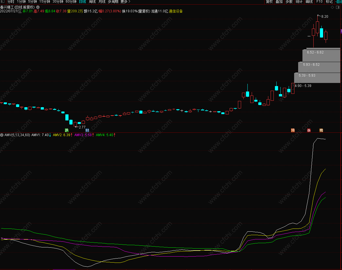 AMV成本价均线是一种特殊的均线指标,它属于主图分析中均线型指标。它和通常所说的股票价格移动平均线(movingaverage,MA)的最大区别在于,AMV成本价均线考虑了交易量的因素。
