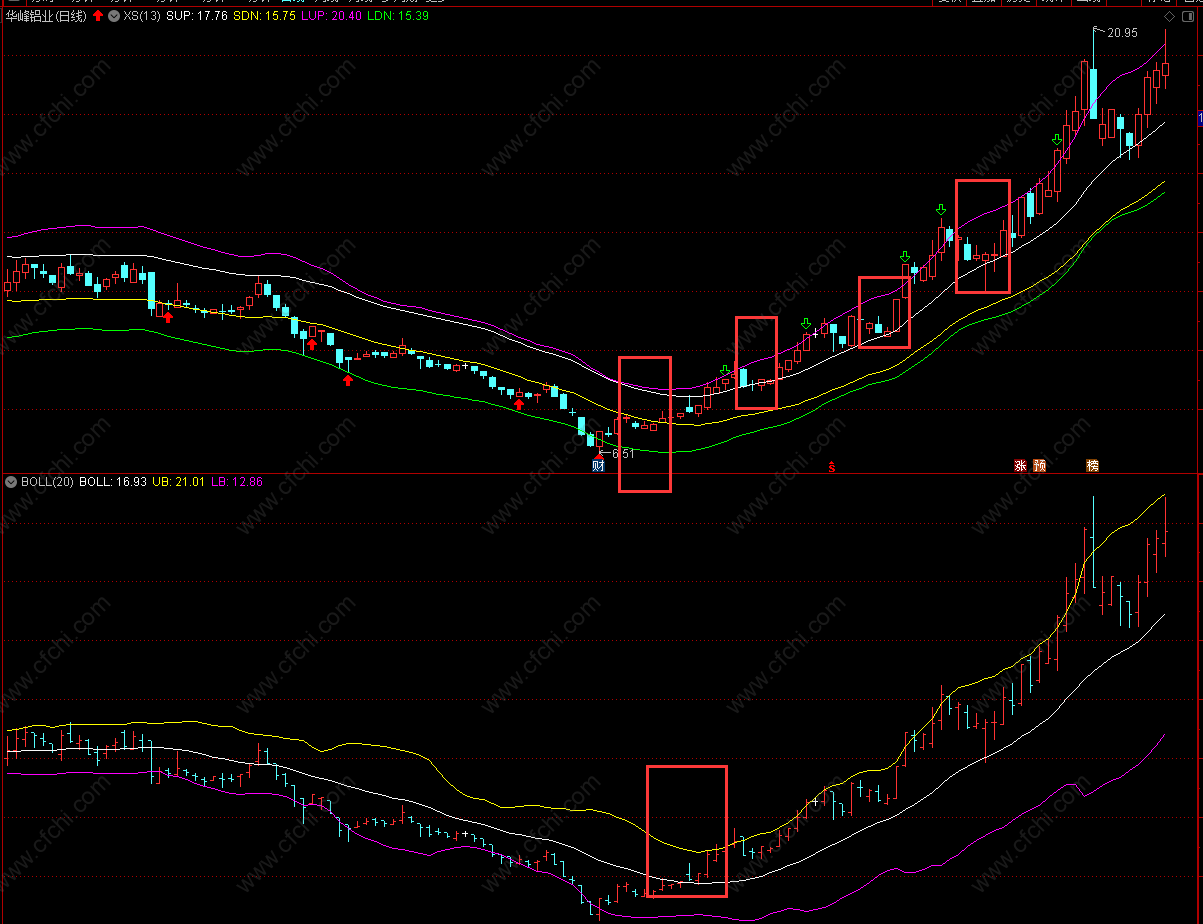 以下面薛斯通道和布林线指标对比,我们可以看出薛斯通道指标对于boll 指标的点位更明显,买入点位更加清晰。