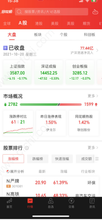 一般股市行情数据包括:A股数据、大盘、市场概括、股票排行、上证指数、深证成指、创业板指数、热点板块等等。