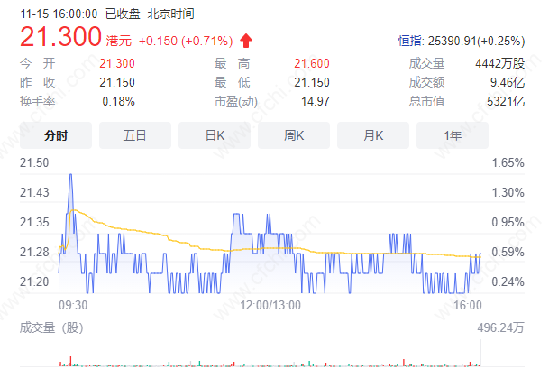 截止目前2021.11.15日,小米公司的股价是:21.30元港币