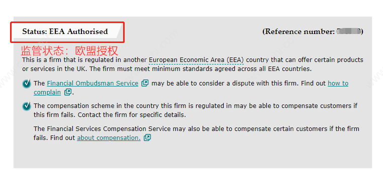 2. EEA Authorised说明是欧盟授权,只允许在英国开展业务,真正的监管机构并不是FCA,而是这家公司所在的欧盟国家的监管机构。