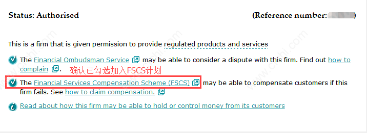 5.确认它是否受英国金融服务补偿保护计划(FSCC)保护如下图所示,在状态栏中有FSCC这项且前面划√,说明是由FSCC补偿计划的。(非英国FCA监管机构可省略此步骤,因为此计划只有FCA有。)